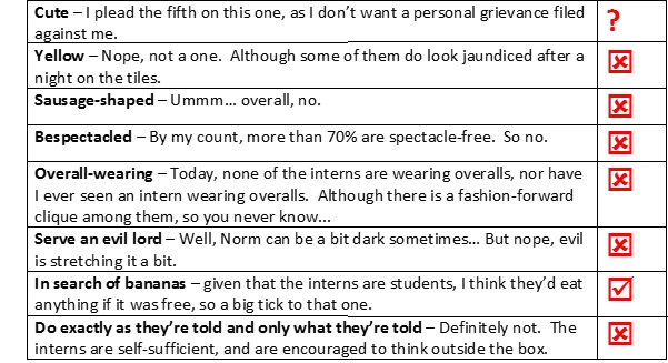 We’ve also learned that Wellington is a well-spring of talent and that our ‘minions’ are mis-named. This is clearly illustrated when I measure Snapper interns against the characteristics of their little yellow namesakes, below: